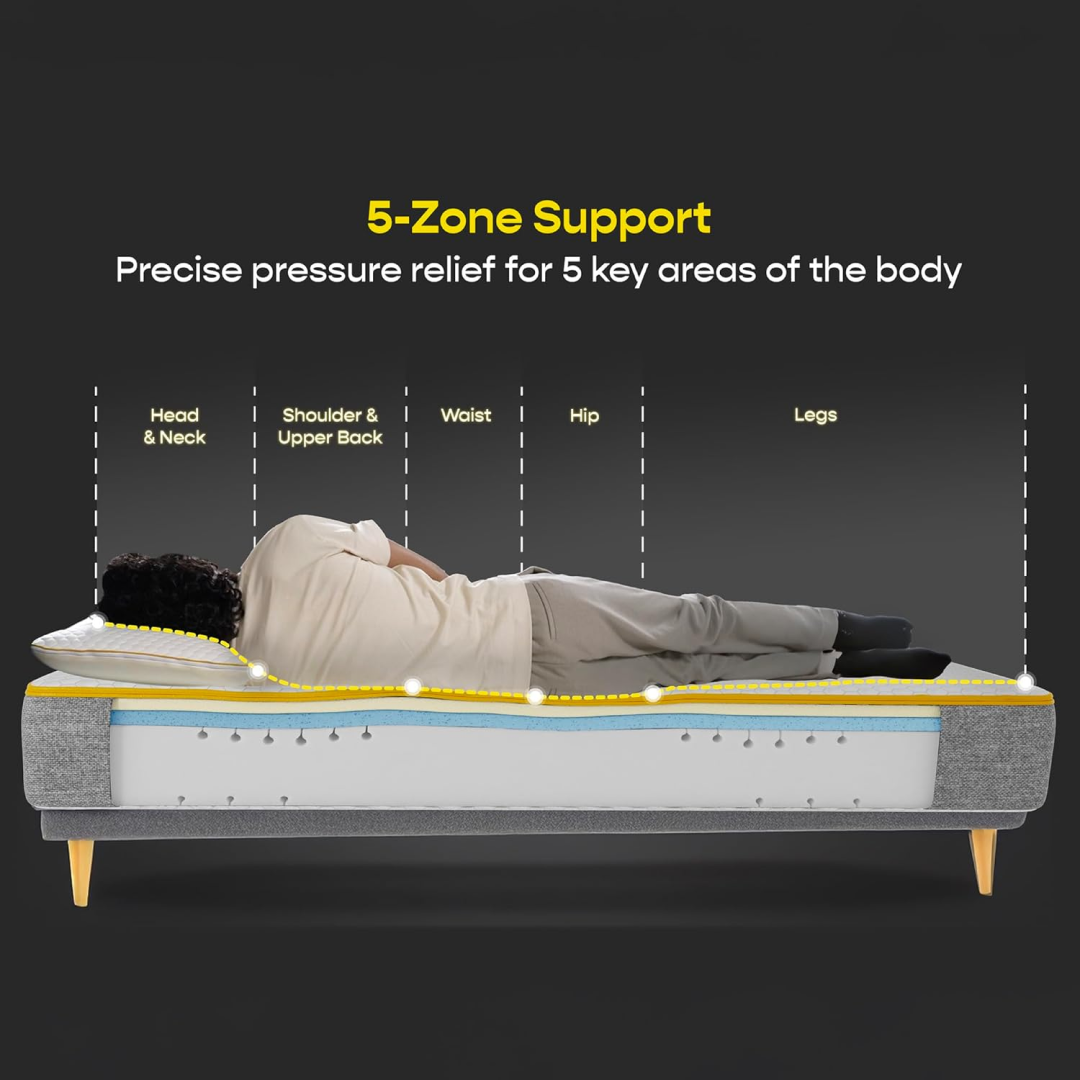 Top layer of latex with Pinhole technology for firm support and Airflow, Open Cell Memory Foam with 5-zone base for orthopedic support.